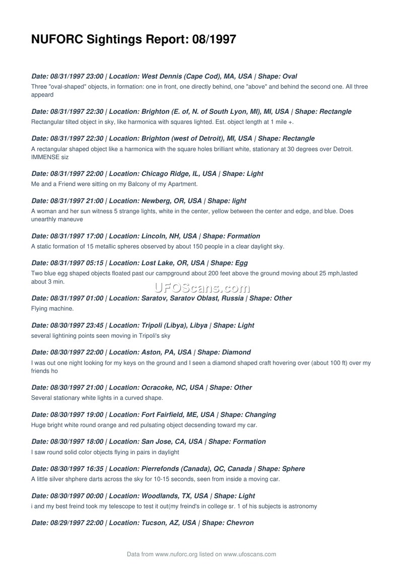 This document is a chronological list of civilian UFO sighting reports collected by the National UFO Reporting Center in August 1997. It documents a wide range of aerial phenomena reported globally, characterized by diverse shapes, behaviors, and flight patterns.
