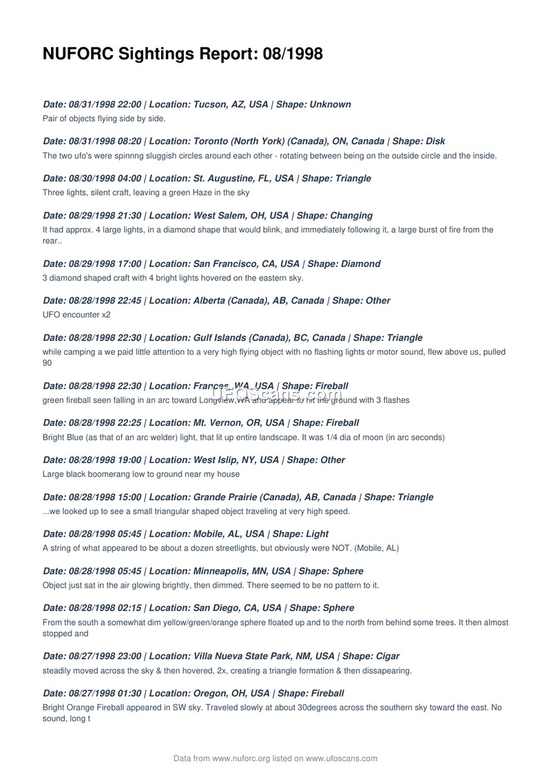 This document is a chronological list of UFO sightings reported to the National UFO Reporting Center during August 1998. It contains hundreds of individual accounts from global locations describing various aerial objects and behaviors.