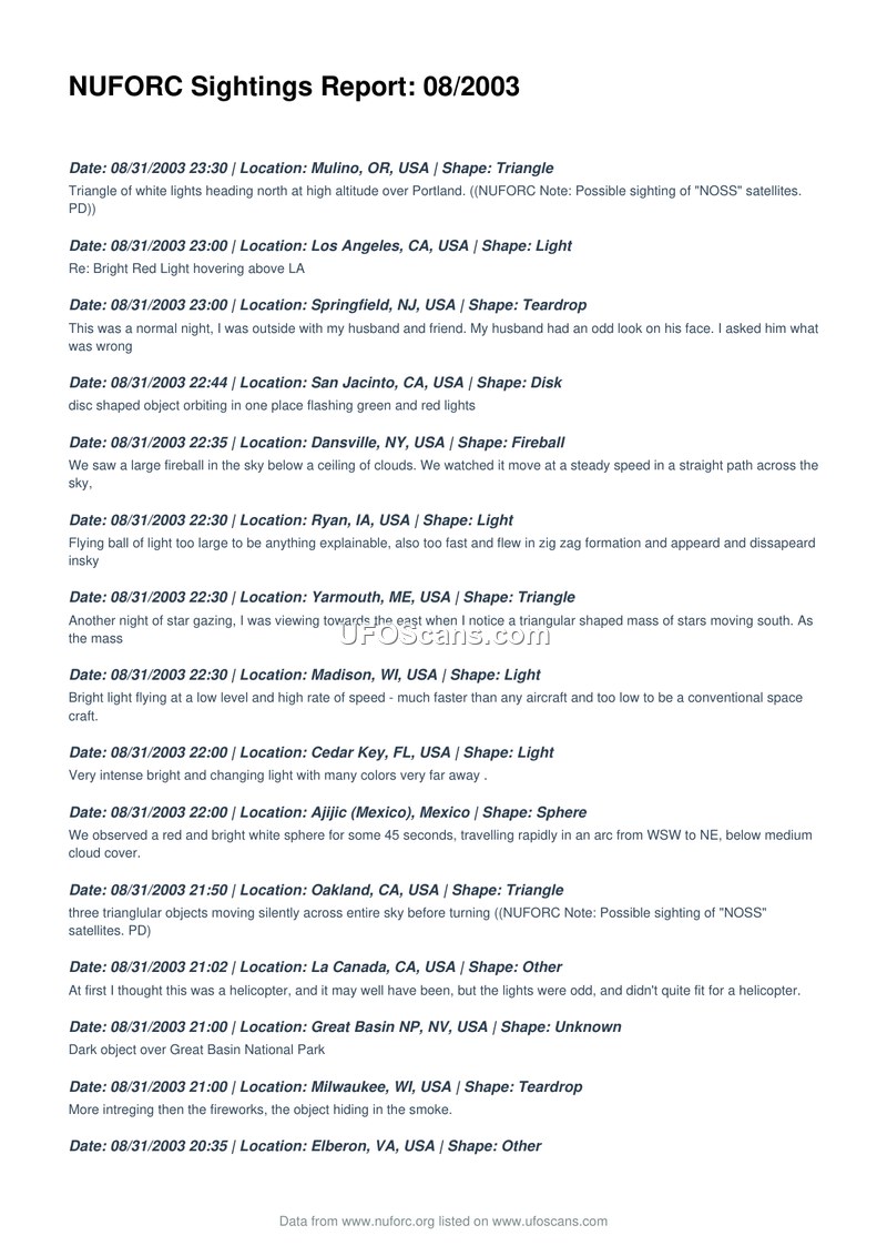 This document is a comprehensive compilation of Unidentified Aerial Phenomena (UAP) sighting reports submitted to the National UFO Reporting Center (NUFORC) during the month of August 2003. The reports are presented in reverse chronological order, spanning from August 31, 2003, back to August 1, 2003. Each entry typically includes the date, time, location, and a brief description of the observed object or phenomenon. The shapes reported are highly varied, including triangles, disks, spheres, fireballs, cigars, teardrops, and various light formations. Many reports describe objects that exhibit unconventional flight characteristics, such as rapid acceleration, hovering, silent movement, or erratic maneuvers that defy conventional explanation. Several entries include notes from NUFORC, suggesting potential identifications for certain sightings, such as U.S. Navy NOSS satellites, meteors (specifically the Perseid meteor shower), or advertising lights. The geographic scope of the reports is international, with the majority originating from the United States and Canada, but also including sightings from the United Kingdom, Australia, Germany, Japan, Brazil, and other nations. The document also captures the subjective experiences of witnesses, ranging from casual observers to individuals with aviation backgrounds, such as a student pilot. Some reports mention specific events, such as the August 2003 North American blackout, which appears to have prompted a surge in reports of unusual aerial activity. Other reports reference external sources, such as HBCCUFO (a Canadian reporting organization) and MUFON, indicating a collaborative network of data collection. The document serves as a raw archive of public-submitted data, reflecting the diverse and often ambiguous nature of UAP reporting during this period.