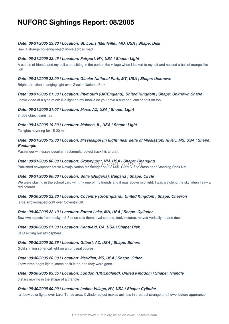 This document is a chronological log of hundreds of UFO/UAP sighting reports submitted to the National UFO Reporting Center during August 2005. It provides a global snapshot of public observations of anomalous aerial phenomena, ranging from simple lights to complex craft.