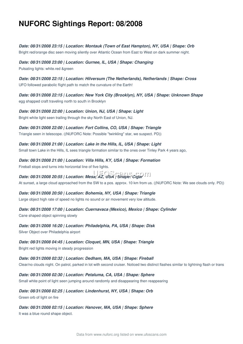 This document is a chronological log of hundreds of UAP sightings reported to the National UFO Reporting Center during August 2008. It captures a wide variety of witness descriptions and locations, serving as a primary record of public reporting for that month.