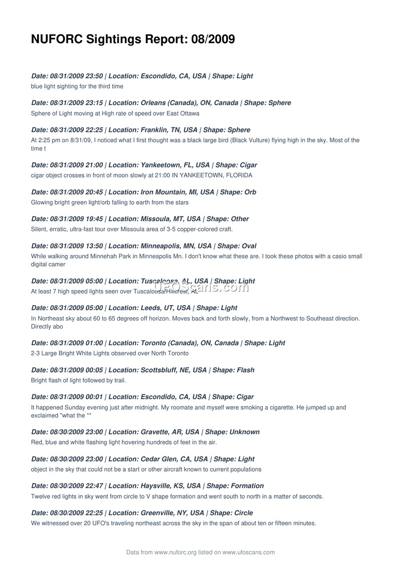This document is a comprehensive compilation of Unidentified Aerial Phenomena (UAP) sighting reports collected by the National UFO Reporting Center (NUFORC) for the month of August 2009. The report spans 30 pages and lists hundreds of individual accounts submitted by witnesses from across the United States, Canada, the United Kingdom, and several other international locations. Each entry provides the date and time of the sighting, the location, the reported shape of the object, and a brief narrative description provided by the witness. The sightings describe a wide variety of phenomena, including lights, spheres, fireballs, triangles, cigars, and discs. Witnesses frequently report erratic movements, high speeds, silent flight, and sudden disappearances. Some entries include brief notes from NUFORC staff, offering potential explanations such as celestial bodies (stars or planets), advertising lights, or meteors, though many reports remain categorized by the witness as unidentified. The document serves as a raw data repository for public reports of anomalous aerial activity during this specific timeframe, reflecting the diverse and often subjective nature of UAP reporting.