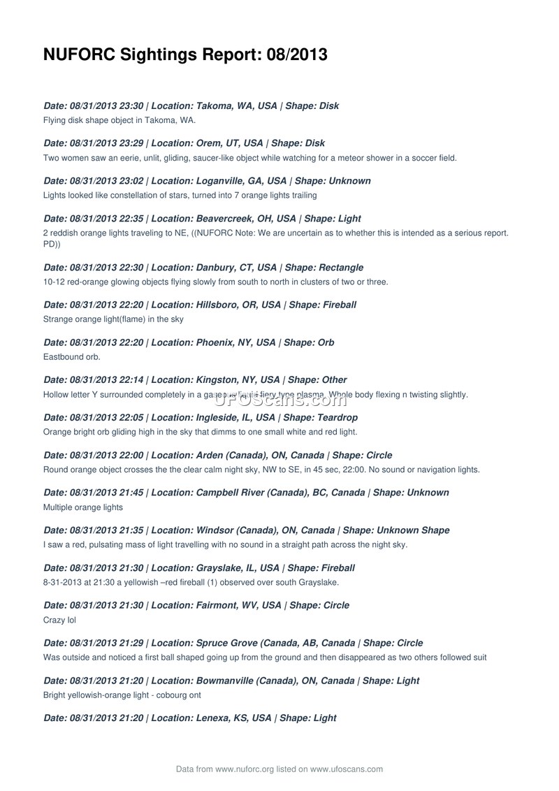 This document serves as a comprehensive log of Unidentified Aerial Phenomena (UAP) sightings reported to the National UFO Reporting Center (NUFORC) throughout August 2013. The compilation lists hundreds of individual entries, each detailing the date, time, location, and reported shape of the observed object. The reports span a wide geographic range, with the vast majority occurring within the United States and Canada, though sightings from the United Kingdom, Germany, Panama, and other international locations are also included. The descriptions provided by witnesses are highly varied. Frequent reports describe 'orange orbs,' 'fireballs,' 'lights in formation,' and 'triangular craft.' Many witnesses describe objects that hover, move at high speeds, change shape, or vanish abruptly. Some reports mention specific behaviors, such as objects moving in unison, splitting into smaller entities, or emitting beams of light. The document includes occasional editorial notes from NUFORC staff, which provide context or potential conventional explanations for certain sightings. For instance, several reports of lights trailing the International Space Station are attributed to the Japanese HTV-4 supply craft. Other notes suggest that certain sightings might be attributed to Iridium satellites, meteor showers, or even advertising lights. The tone of the reports varies from objective descriptions of movement and appearance to more subjective accounts of personal experiences, including claims of telepathic communication or encounters with non-human entities. The document provides a snapshot of public perception and reporting trends regarding UAP during this specific month in 2013, highlighting the prevalence of orange-colored light phenomena and the tendency for witnesses to interpret these events in the context of their local environment and current events, such as space station flyovers.