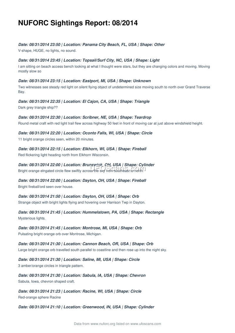 This document is a comprehensive compilation of sighting reports submitted to the National UFO Reporting Center (NUFORC) for the month of August 2014. The report spans 55 pages and lists hundreds of individual accounts of Unidentified Aerial Phenomena (UAP) observed globally, though the vast majority of reports originate from the United States. Each entry provides the date, time, location, and a brief description of the observed object or phenomenon, often categorized by shape, such as 'Circle,' 'Fireball,' 'Triangle,' 'Light,' 'Orb,' 'Cylinder,' 'Disk,' 'Oval,' 'Diamond,' 'Chevron,' 'Teardrop,' 'Rectangle,' 'Cross,' 'Formation,' or 'Other.' The reports describe a wide variety of behaviors, including hovering, rapid movement, sudden appearance or disappearance, and changes in color or shape. Many witnesses report objects that do not conform to conventional aircraft, noting features like lack of sound, extreme speed, or unusual light patterns. Some entries include brief editorial notes from NUFORC, occasionally suggesting potential explanations such as advertising lights, meteors, or astronomical phenomena like the conjunction of Jupiter and Venus. The document serves as a raw data repository for public sightings during this specific timeframe, reflecting the diverse and often subjective nature of UAP reporting.