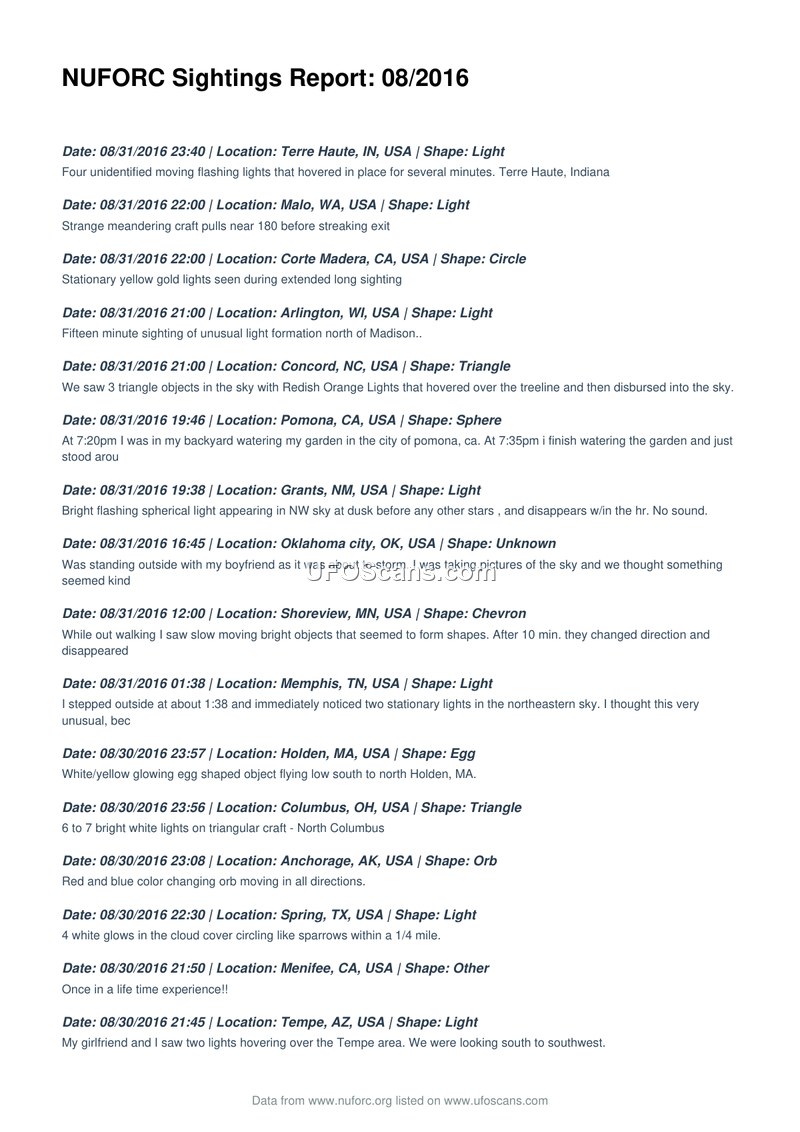 This document is a comprehensive compilation of Unidentified Aerial Phenomena (UAP) sighting reports collected by the National UFO Reporting Center (NUFORC) for the month of August 2016. The report spans 34 pages and lists hundreds of individual accounts submitted by witnesses from across the United States and several international locations, including Canada, the United Kingdom, France, Iran, Serbia, Sri Lanka, and Norway. The reports are presented in a chronological format, beginning with August 31, 2016, and concluding with August 1, 2016. Each entry provides the date and time of the sighting, the location, the reported shape of the object, and a brief narrative description provided by the witness. The shapes reported are highly varied, including lights, spheres, triangles, circles, orbs, fireballs, cigars, ovals, chevrons, and other miscellaneous forms. Witness descriptions frequently mention characteristics such as silent movement, rapid speed, erratic flight patterns, hovering, and color-changing lights. Some reports include specific details about the environment, such as proximity to military installations like Fort Bragg or Simmons Airfield, or sightings occurring during meteor showers, such as the Perseid meteor shower. In several instances, NUFORC has appended brief notes to the reports, offering potential conventional explanations for the sightings, such as the International Space Station (ISS), Iridium satellites, aircraft, or insects. Other reports are marked as anonymous or re-posted. The document serves as a raw data repository of public observations, capturing a wide spectrum of aerial phenomena as perceived and reported by the general public during this specific timeframe.