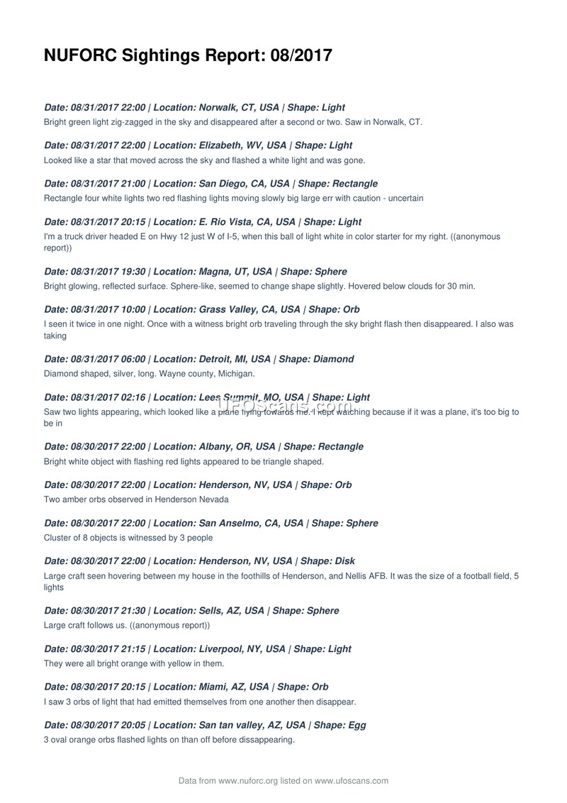 This document is a monthly compilation of hundreds of UFO sighting reports submitted to the National UFO Reporting Center in August 2017. It documents a wide range of aerial phenomena reported globally, with many sightings coinciding with the August 2017 solar eclipse.