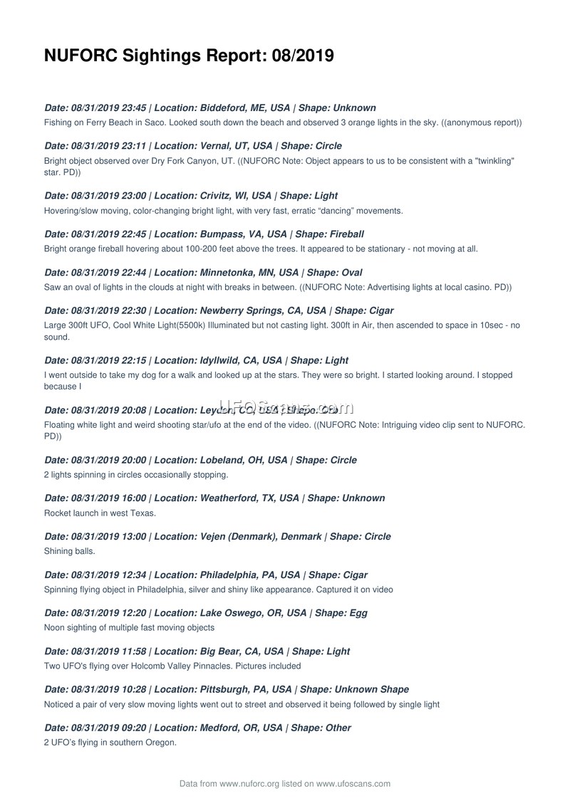 This document is a chronological compilation of hundreds of UAP sighting reports submitted to the National UFO Reporting Center during August 2019. It provides a raw dataset of witness descriptions, locations, and object characteristics, occasionally supplemented by NUFORC staff notes.