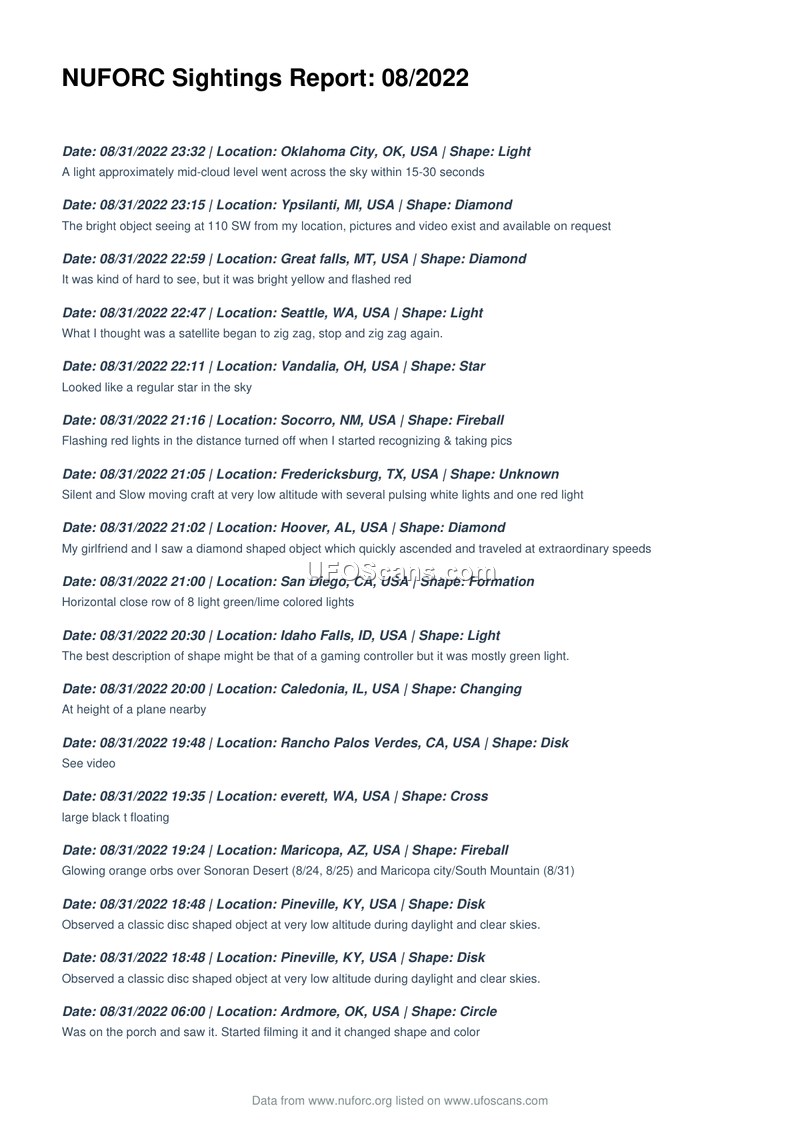 This document is a comprehensive compilation of Unidentified Aerial Phenomena (UAP) sighting reports submitted to the National UFO Reporting Center (NUFORC) for the month of August 2022. The report spans 33 pages and contains hundreds of individual entries, each detailing a specific sighting reported by members of the public. Each entry includes the date and time of the event, the location, the reported shape of the object, and a brief narrative description provided by the witness. The sightings are global in scope, though the majority originate from the United States. The reported shapes are highly varied, including spheres, disks, cigars, triangles, rectangles, fireballs, and various light formations. Witness descriptions often emphasize unusual flight characteristics, such as erratic movement, extreme speed, sudden appearance or disappearance, and silent operation. Many witnesses report capturing photographic or video evidence of the phenomena. The reports reflect a wide range of experiences, from casual observations of lights in the sky to more detailed accounts of structured craft. Some witnesses describe interactions or specific behaviors, such as objects following aircraft, hovering over terrain, or changing shape and color. The document serves as a raw data repository for public-submitted accounts, reflecting the diverse and often subjective nature of UAP reporting during this period. No official analysis or conclusion is provided for these sightings; the document functions strictly as a record of the reports received by the organization.