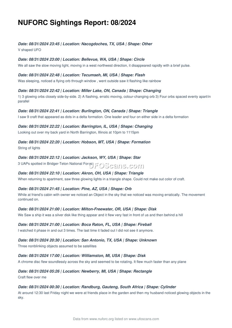 This document is a comprehensive compilation of Unidentified Aerial Phenomena (UAP) sightings reported to the National UFO Reporting Center (NUFORC) during the month of August 2024. The report spans 18 pages and lists hundreds of individual accounts submitted by witnesses from various locations globally, including the United States, Canada, the United Kingdom, Turkey, Brazil, and others. The entries are organized chronologically, beginning with reports from August 31, 2024, and extending back through the month to August 1, 2024. Each entry provides the date, time, location, and the reported shape of the object, followed by a brief narrative description of the sighting. The shapes reported are highly diverse, including orbs, disks, triangles, cylinders, rectangles, chevrons, and various light phenomena. Witness descriptions frequently highlight anomalous behaviors, such as erratic movement, sudden acceleration, hovering, silent flight, and the ability to change shape or color. Many witnesses describe the objects as moving in ways that defy conventional aircraft capabilities, with some noting the absence of sound or the presence of unusual light patterns. Several reports mention the use of technology to document the events, including photographs, video recordings, and the use of telescopes or binoculars. Some witnesses compare the objects to known entities, such as satellites, drones, or military aircraft, only to conclude that the observed behavior was inconsistent with these explanations. The document serves as a raw data repository for public reports, capturing a wide spectrum of human experiences regarding unexplained aerial activity during this specific timeframe.