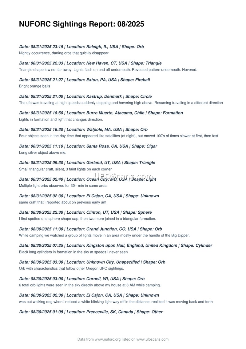 This document is a chronological compilation of hundreds of UAP sightings reported to NUFORC throughout August 2025. It provides a global overview of witness accounts describing diverse object shapes and anomalous flight behaviors.
