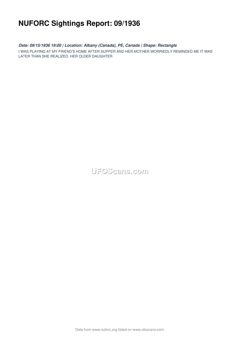 This document is a brief sighting report archived by the National UFO Reporting Center (NUFORC). It records an event that occurred on September 15, 1936, at 19:00 in Albany, Prince Edward Island, Canada. The object observed is described as having a rectangular shape. The narrative provided by the witness is incomplete, noting only that the witness was playing at a friend's home after supper when the friend's mother worriedly reminded the witness that it was later than she had realized. The text ends abruptly after mentioning the friend's older daughter.