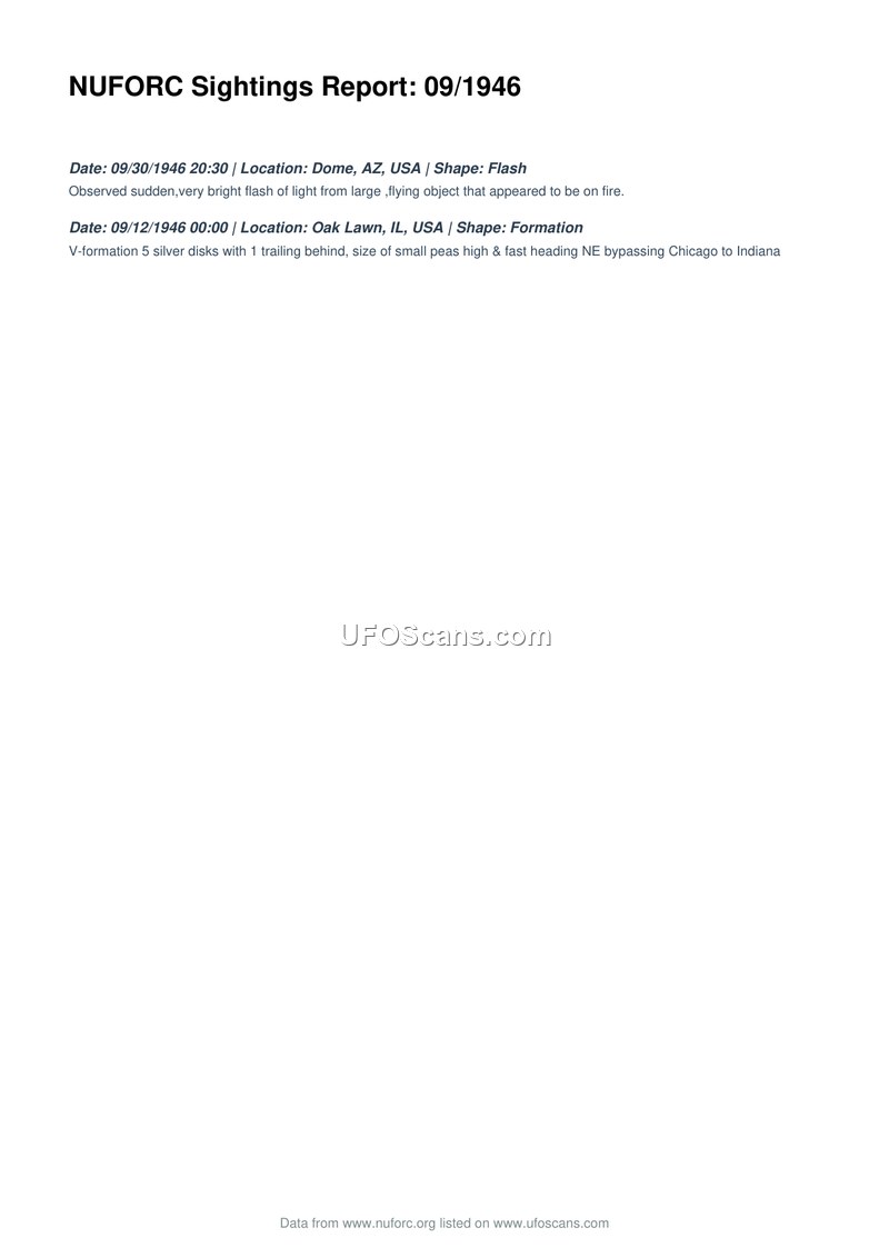 This document provides a summary of two specific aerial phenomena reported to the National UFO Reporting Center (NUFORC) during September 1946. The first incident occurred on September 30, 1946, at 20:30 in Dome, Arizona. The witness reported a sudden, very bright flash of light emanating from a large flying object that appeared to be on fire. The second incident took place on September 12, 1946, at 00:00 in Oak Lawn, Illinois. This sighting involved a V-formation of five silver disks with one additional object trailing behind. The objects were described as being the size of small peas, appearing high in the sky, and moving at a fast speed while heading northeast, bypassing Chicago toward Indiana.