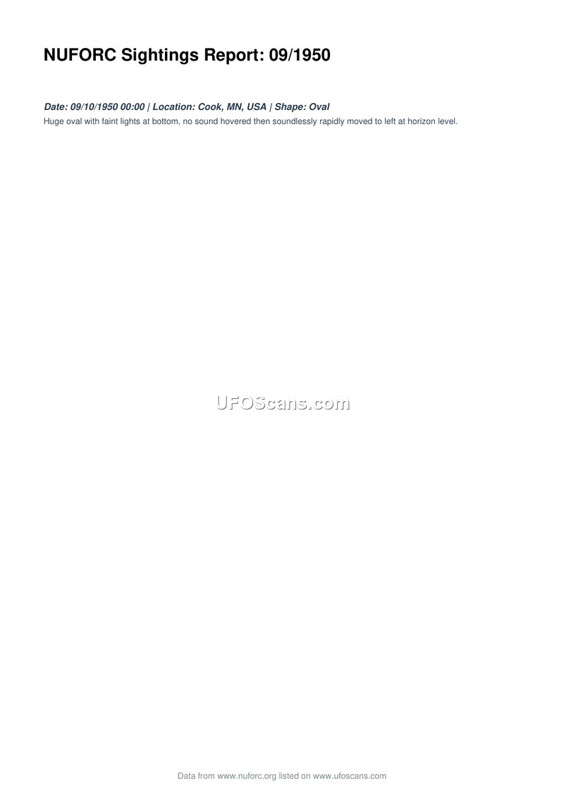 This document is a sighting report compiled by the National UFO Reporting Center (NUFORC) regarding an event that occurred on September 10, 1950, in Cook, Minnesota. The report describes a single, huge, oval-shaped object observed at midnight. The object featured faint lights at its bottom. According to the report, the object initially hovered in place without making any sound. Subsequently, it moved rapidly to the left at horizon level, maintaining its silent operation throughout the duration of the event.