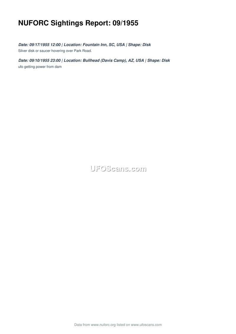 This document, titled 'NUFORC Sightings Report: 09/1955', provides a brief summary of two unidentified aerial phenomena sightings recorded by the National UFO Reporting Center for the month of September 1955. The first incident occurred on September 17, 1955, at 12:00 in Fountain Inn, South Carolina, where a silver disk or saucer was observed hovering over Park Road. The second incident took place on September 10, 1955, at 23:00 in Bullhead (Davis Camp), Arizona. In this instance, a disk-shaped object was reported to be obtaining power from a dam. The document serves as a historical record of these reported sightings.