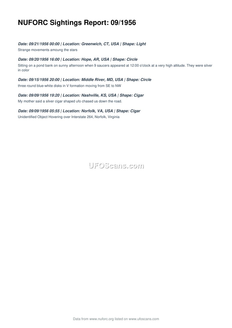 This document is a compilation of five separate UFO sighting reports from September 1956, as recorded by the National UFO Reporting Center (NUFORC). The reports span various locations across the United States, including Connecticut, Arkansas, Maryland, Kansas, and Virginia. The sightings describe a variety of phenomena, ranging from 'strange movements among the stars' in Greenwich, Connecticut, to a formation of nine silver saucers observed at a high altitude in Hope, Arkansas. Other reports include three blue-white disks in a V-formation over Middle River, Maryland, and two separate sightings of cigar-shaped objects in Nashville, Kansas, and Norfolk, Virginia. One witness in Kansas reported that a silver cigar-shaped object chased their vehicle, while the Norfolk sighting involved an object hovering over Interstate 264.