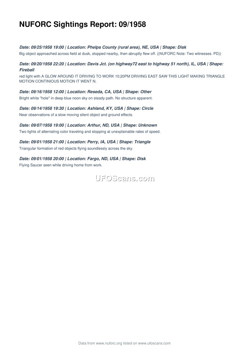 This document is a compilation of seven UFO sighting reports recorded by the National UFO Reporting Center (NUFORC) for the month of September 1958. The sightings occurred across various locations in the United States, including Nebraska, Illinois, California, Kentucky, North Dakota, and Iowa. The reported phenomena varied in description, ranging from a disk-shaped object in Phelps County, Nebraska, to a fireball in Davis Jct., Illinois, and a bright white 'hole' in the sky over Reseda, California. Other reports included a circle in Ashland, Kentucky, unknown lights in Arthur, North Dakota, a triangle in Perry, Iowa, and a disk in Fargo, North Dakota. The descriptions provided by witnesses include observations of silent flight, rapid speed changes, and ground effects. One entry specifically notes the presence of two witnesses for the Phelps County sighting.