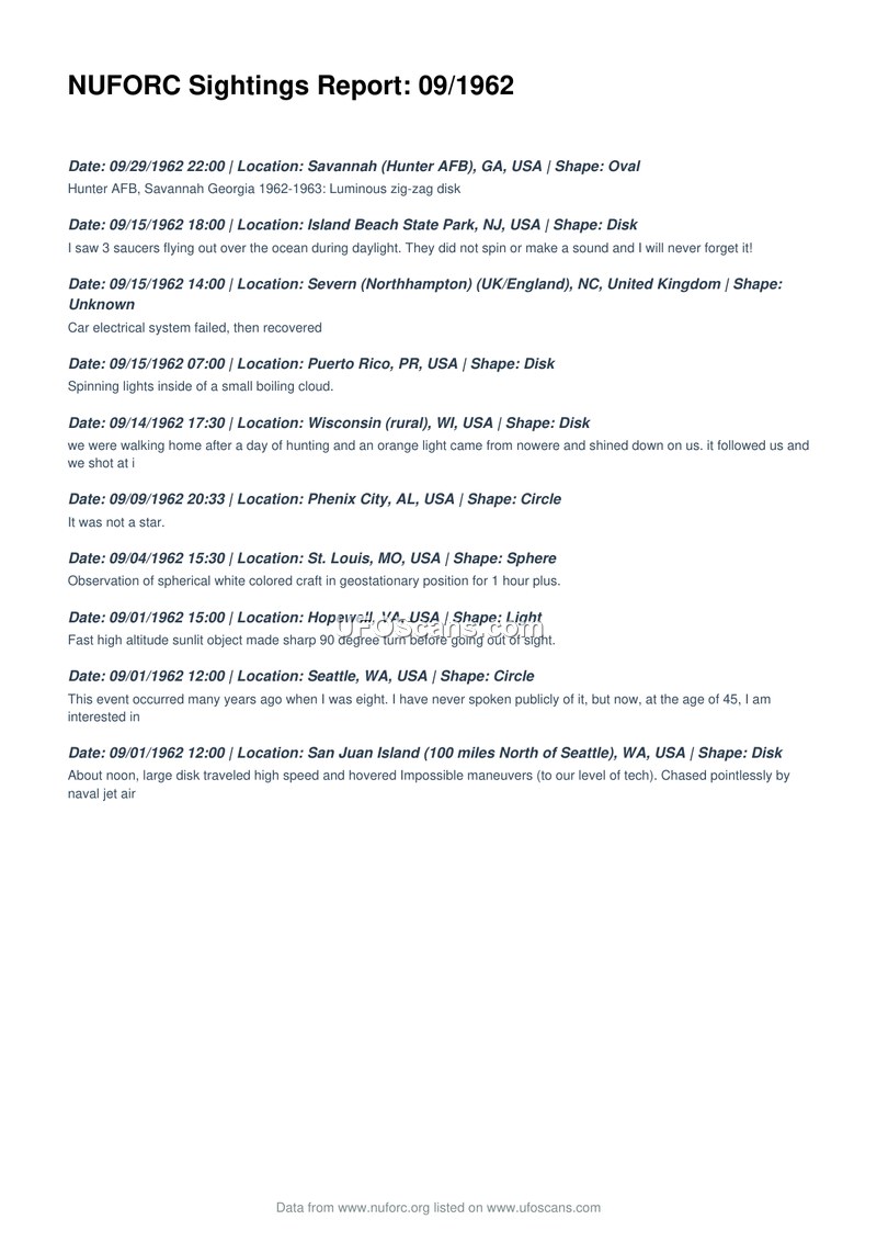 This document is a compilation of UFO sightings reported to the National UFO Reporting Center (NUFORC) for the month of September 1962. The report lists ten distinct incidents occurring across the United States and one in the United Kingdom. The sightings describe a variety of phenomena, including luminous disks, spherical craft, and unidentified lights. Notable reports include a car electrical failure in Severn, UK, associated with an unknown object; a sighting of three saucers at Island Beach State Park, NJ; and a high-speed disk near San Juan Island, WA, which was reportedly chased by naval jet aircraft. Other accounts involve witnesses observing objects in geostationary positions, performing sharp maneuvers, or emitting light. The document serves as a historical record of these civilian-reported encounters, capturing the diverse nature of UAP observations during that period.