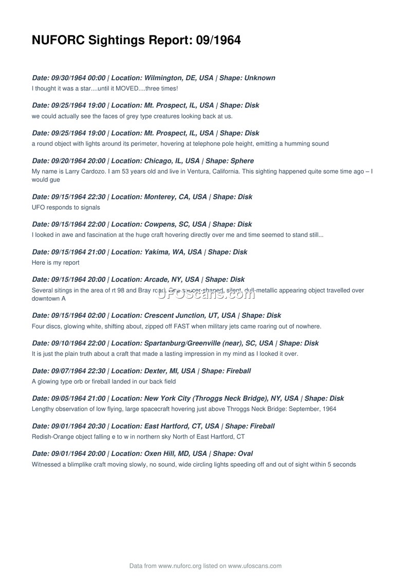 This document is a summary of fourteen UFO sightings reported across the United States during September 1964. It includes diverse descriptions of aerial phenomena, ranging from glowing orbs to disk-shaped craft and alleged encounters with non-human entities.