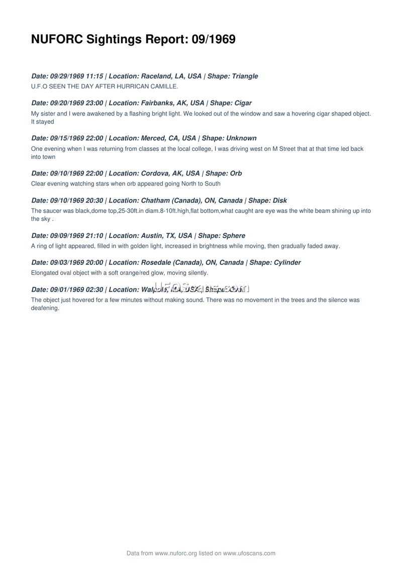 This document provides a chronological list of eight UFO sightings reported to NUFORC during September 1969. It details the date, location, and shape of the objects observed across North America.