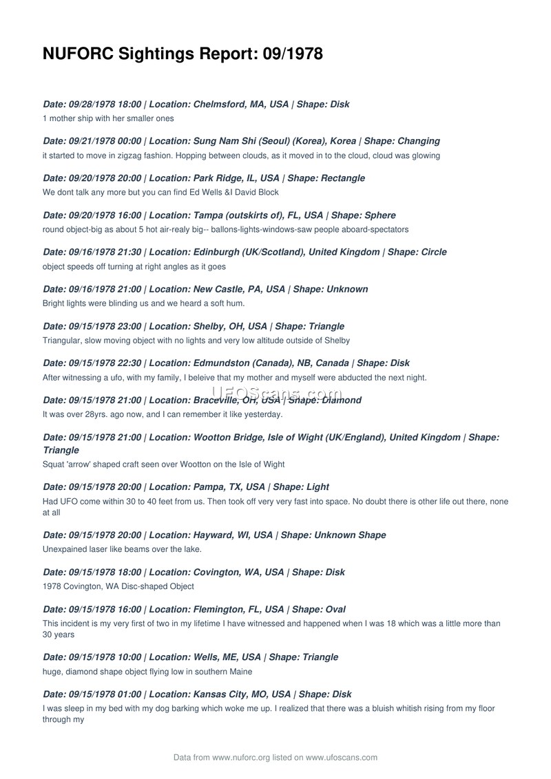 This document is a compilation of UFO sighting reports for the month of September 1978, sourced from the National UFO Reporting Center (NUFORC). The report lists numerous incidents occurring across the United States, Canada, the United Kingdom, and South Korea. The sightings describe a wide variety of phenomena, including disk-shaped objects, triangular craft, spheres, lights, and other unidentified shapes. Specific reports include a mother ship with smaller craft in Chelmsford, Massachusetts; a zigzagging object in Seoul, Korea; a large, windowed sphere in Tampa, Florida; and a triangular craft over Wootton Bridge on the Isle of Wight. Several witnesses reported physical or psychological impacts, such as a potential abduction in Edmundston, Canada, and a witness in Kansas City who reported a bluish-whitish light rising from the floor while they were in bed. Other reports mention military-related contexts, such as a sighting at Schofield Barracks in Hawaii involving three orbs, and a silent black helicopter observed in Imperial Beach, California. The reports vary in detail, with some witnesses providing specific descriptions of movement, such as right-angle turns or high-speed flight, while others focus on the emotional or long-term impact of the encounter. The document serves as a chronological log of these civilian-reported events throughout the month.