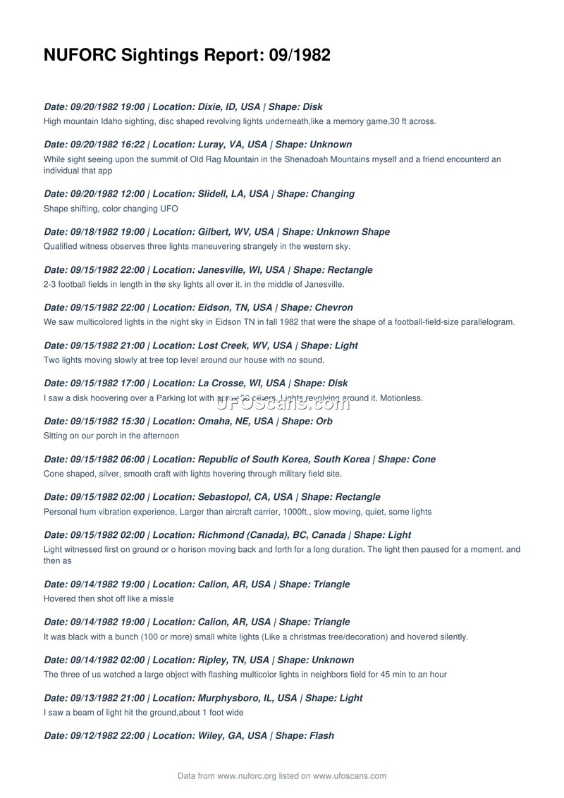 This document is a chronological list of 23 UFO sightings reported to the National UFO Reporting Center in September 1982. It provides brief descriptions of the objects, locations, and dates for each incident.
