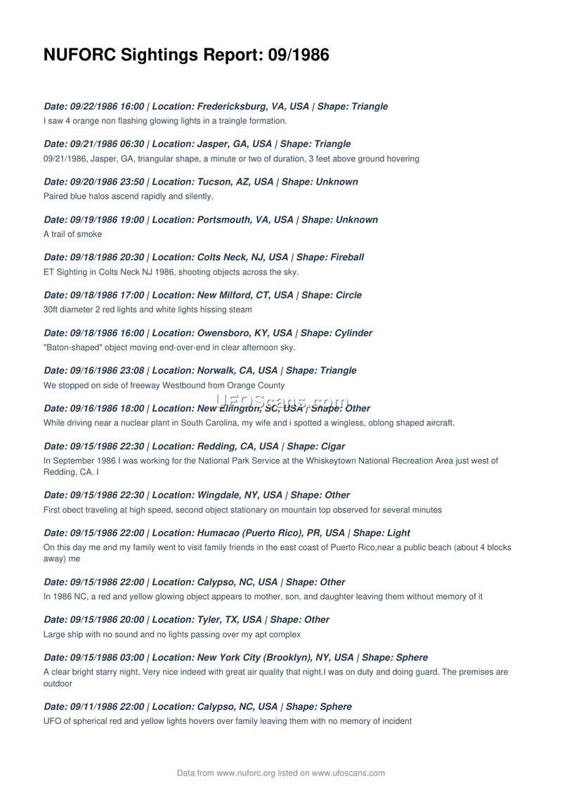 This document is a compilation of UFO sighting reports from September 1986, sourced from the National UFO Reporting Center (NUFORC). The report lists various incidents across the United States, Puerto Rico, and Chile. The sightings describe a wide array of phenomena, including triangular formations, glowing lights, metallic spheres, and cigar-shaped objects. Specific reports include a witness in Fredericksburg, VA, observing four orange non-flashing lights in a triangle formation, and a report from New Ellington, SC, involving a wingless, oblong-shaped aircraft spotted near a nuclear plant. Other notable entries include a report from Calypso, NC, where a family experienced a red and yellow glowing object and subsequent memory loss, and a mass sighting of a shiny metallic sphere in Valparaiso, Chile. The document also notes sightings of 'creatures or aliens' in Virginia Beach, VA, and a possible military test craft in Oak Harbor, WA. The reports vary in detail, with some providing specific descriptions of movement, such as 'baton-shaped' objects moving end-over-end or objects hovering silently. The document serves as a chronological record of public reports submitted to the NUFORC during that month.