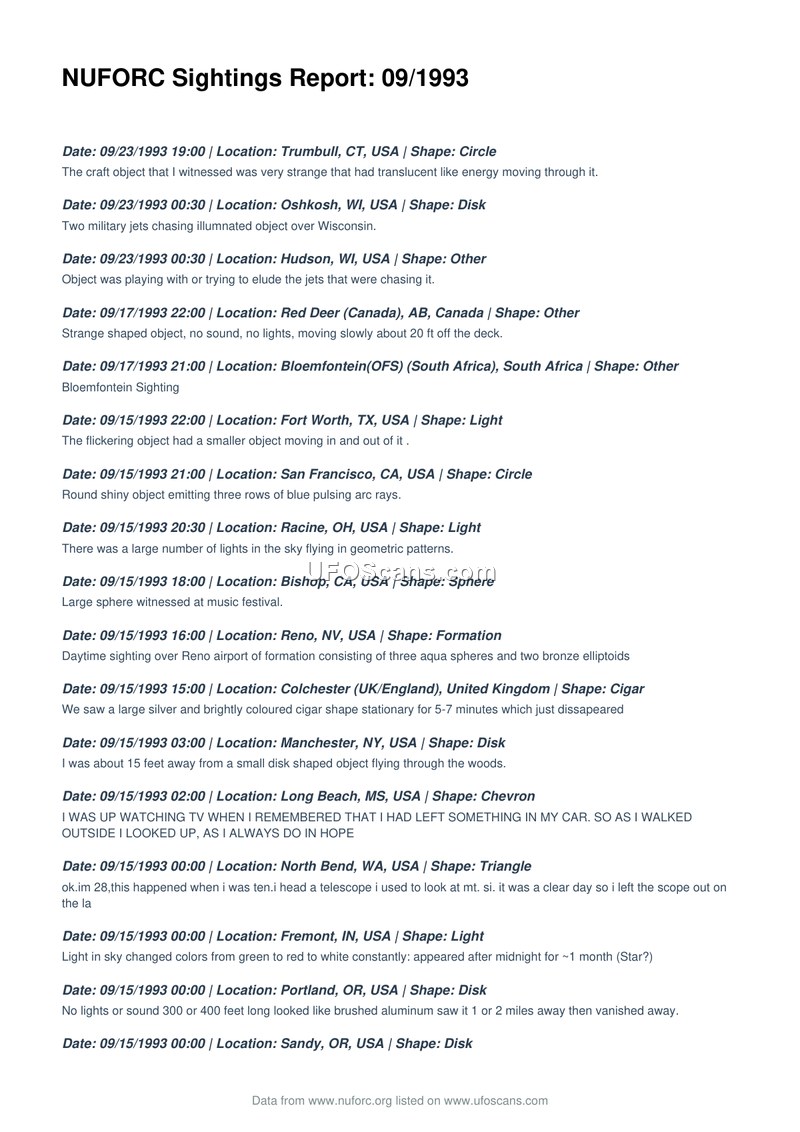This document is a chronological list of UFO sightings reported to the National UFO Reporting Center during September 1993. It details various aerial phenomena observed globally, ranging from geometric light patterns to structured craft.