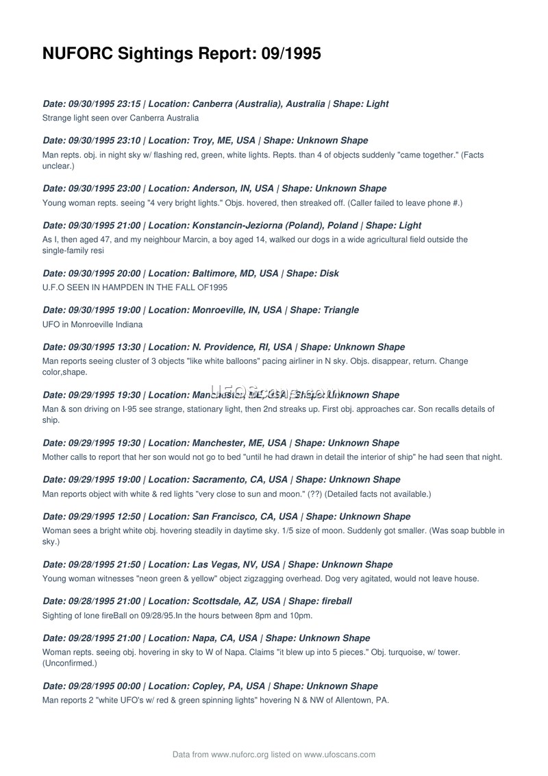 This document is a comprehensive compilation of Unidentified Aerial Phenomena (UAP) sightings reported to the National UFO Reporting Center (NUFORC) during the month of September 1995. The report lists hundreds of individual accounts from witnesses across the United States, Canada, Australia, Greece, and the United Kingdom. The sightings vary significantly in nature, ranging from simple observations of lights in the sky to complex encounters with structured craft. Common descriptions include triangular, disc-shaped, cigar-shaped, and spherical objects, often exhibiting unconventional flight characteristics such as rapid acceleration, hovering, zigzagging, and silent movement. Many reports mention specific colors, such as bright white, red, green, orange, and metallic hues. Several witnesses describe objects interacting with their environment, such as beaming light at houses or fields, or appearing to pace aircraft. The reports frequently involve multiple witnesses, including law enforcement officers, FAA controllers, and military personnel. Some accounts detail physical or physiological reactions, such as agitated animals, buzzing sounds, or feelings of time loss. The document serves as a raw data repository for these reports, often including brief notes on the credibility or status of the sighting, such as 'unconfirmed' or 'facts unclear.' The compilation reflects the diverse and often anecdotal nature of public UAP reporting during this period, capturing a wide spectrum of human experiences and interpretations of aerial anomalies.