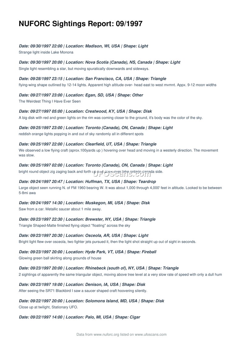 This document is a chronological log of UFO sightings reported to the National UFO Reporting Center in September 1997. It catalogs diverse aerial phenomena observed globally by the public.