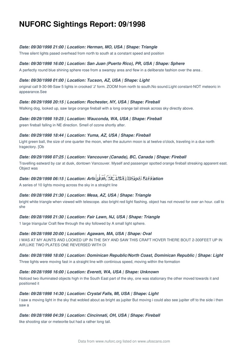 This document is a comprehensive compilation of UFO and UAP sighting reports submitted to the National UFO Reporting Center (NUFORC) during the month of September 1998. The reports are presented in chronological order, spanning from September 1st through September 30th, 1998. Each entry provides the date, time, location, and a brief description of the observed phenomenon, along with the reported shape of the object. The sightings occurred globally, with a high concentration of reports from the United States, Canada, and Australia, as well as isolated reports from Europe and Egypt. The descriptions of the objects vary significantly, including fireballs, triangles, spheres, disks, cigars, and various lights. Many witnesses describe objects moving at high speeds, hovering, or performing maneuvers that they deemed inconsistent with conventional aircraft. Several reports mention specific environmental reactions, such as the smell of ozone, or the behavior of animals, such as dogs barking. Some witnesses reported the objects in relation to other celestial bodies like the moon or Jupiter, or in proximity to military airfields and infrastructure. The document serves as a raw data repository for public sightings, reflecting the diverse and often subjective nature of UAP reporting during this period. The reports frequently reference the influence of media, such as radio host Art Bell, in prompting public awareness and subsequent reporting of these events.