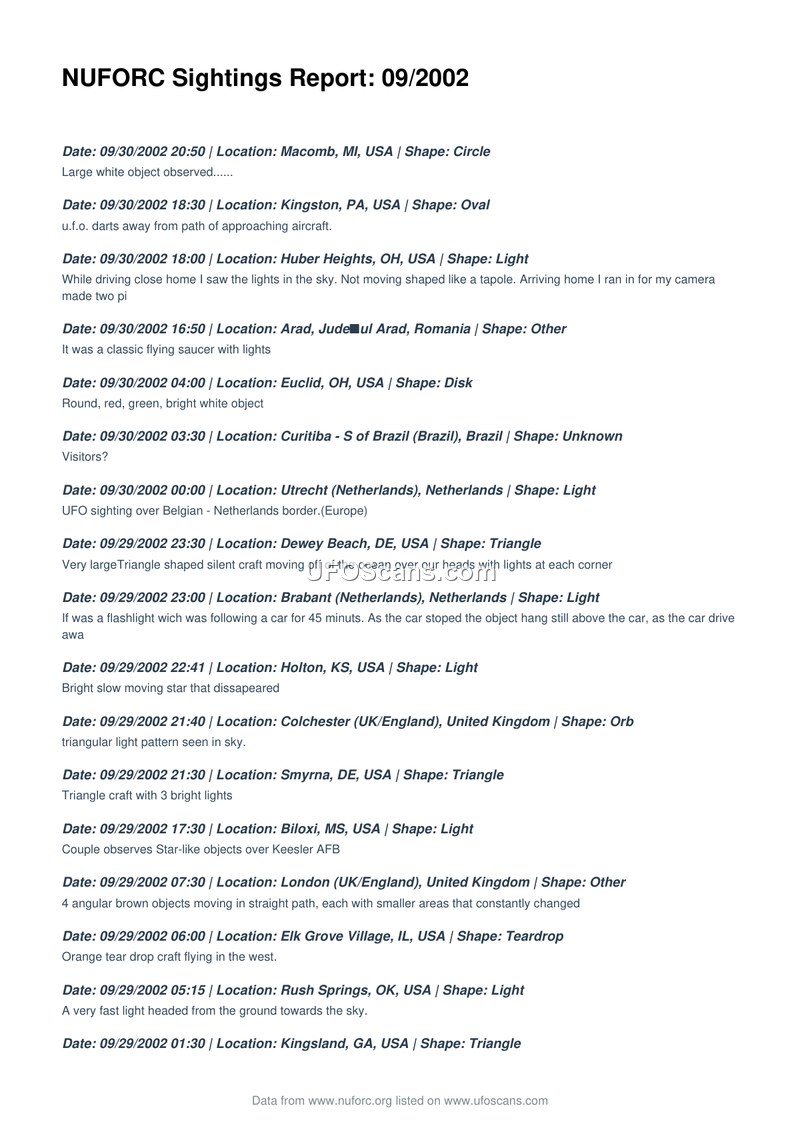This document is a chronological compilation of hundreds of UAP sighting reports submitted to the National UFO Reporting Center (NUFORC) during September 2002. It documents a wide variety of aerial phenomena reported globally, ranging from simple lights to complex craft, often including witness descriptions of unusual flight behavior.