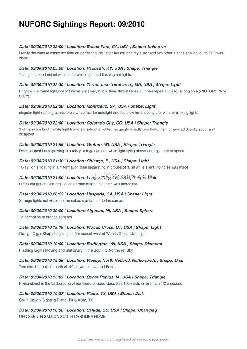 This document is a comprehensive compilation of UFO sighting reports submitted to the National UFO Reporting Center (NUFORC) for the month of September 2010. The report lists hundreds of individual accounts from various locations across the United States, Canada, and several international sites including the United Kingdom, Italy, Spain, the Philippines, and Turkey. The entries are organized chronologically, beginning on September 30, 2010, and extending back through the month to September 1, 2010. Each entry provides the date, time, location, and a brief description of the observed object's shape and behavior. The reported phenomena vary significantly in description, ranging from simple lights and fireballs to complex geometric shapes such as triangles, disks, spheres, cigars, and chevrons. Witnesses frequently describe objects that exhibit high speeds, silent flight, abrupt changes in direction, and hovering capabilities. Some reports mention specific details such as formation flying, blinking lights, and, in rare instances, interactions with other aircraft or environmental features. Several entries include editorial notes from NUFORC, which occasionally suggest alternative explanations for the sightings, such as stars, planets, or satellites, reflecting the center's role in documenting and potentially filtering these reports. The document serves as a raw data repository for public-submitted accounts, capturing a wide spectrum of aerial observations reported during this specific timeframe.