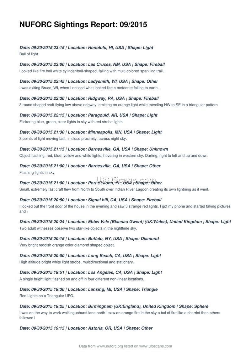 This document is a chronological compilation of hundreds of public UFO sightings reported to NUFORC throughout September 2015. It documents a wide range of aerial phenomena observed globally, with varying degrees of detail and occasional notes on potential conventional explanations.