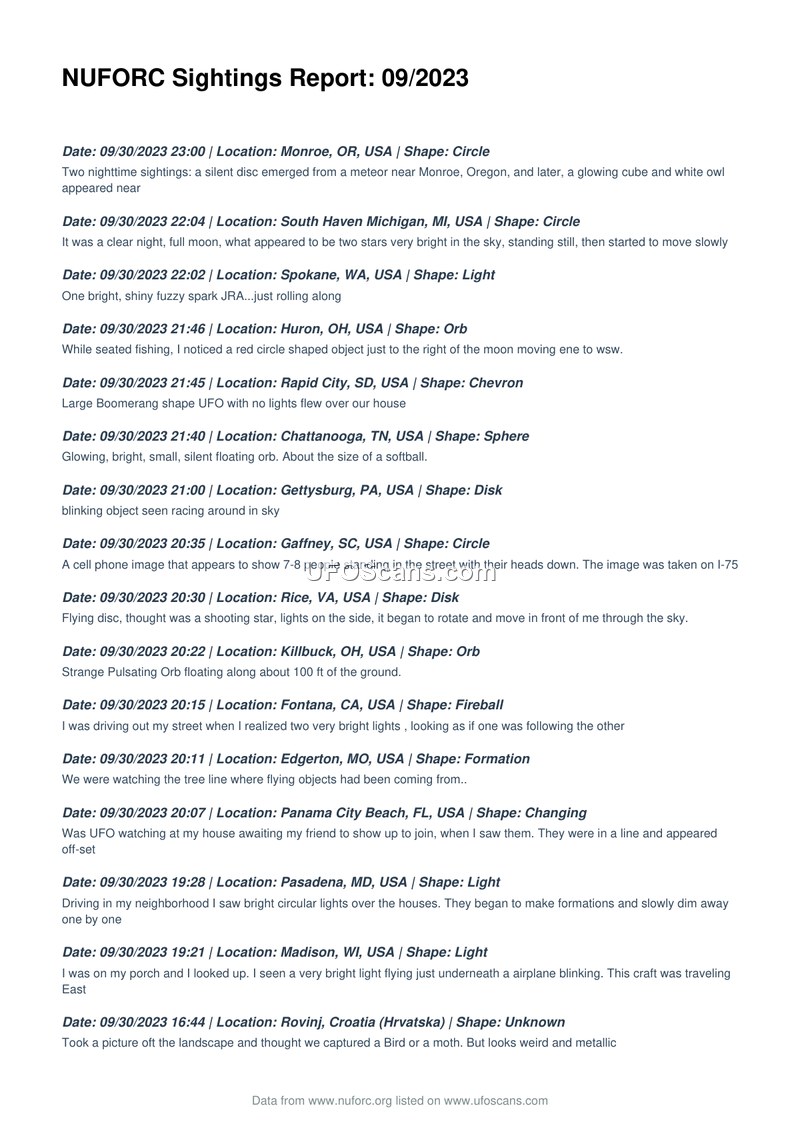NUFORC Sightings Report: 09/2023