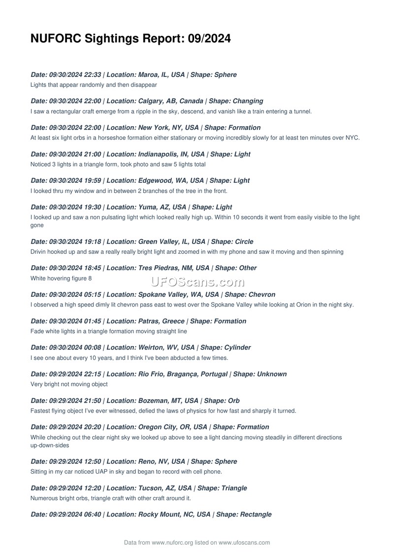 NUFORC Sightings Report: 09/2024