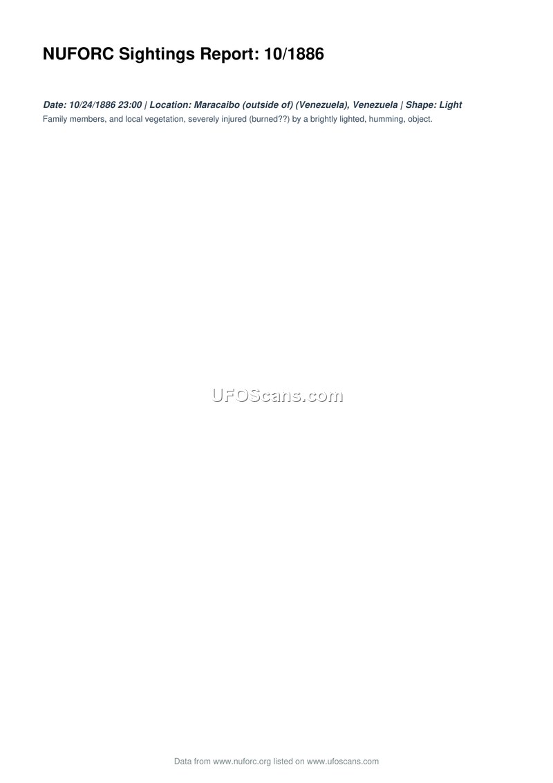 A 1886 sighting report from NUFORC details an encounter near Maracaibo, Venezuela, involving a humming, lighted object that allegedly caused injuries to family members and vegetation. The report suggests the injuries may have been burns.