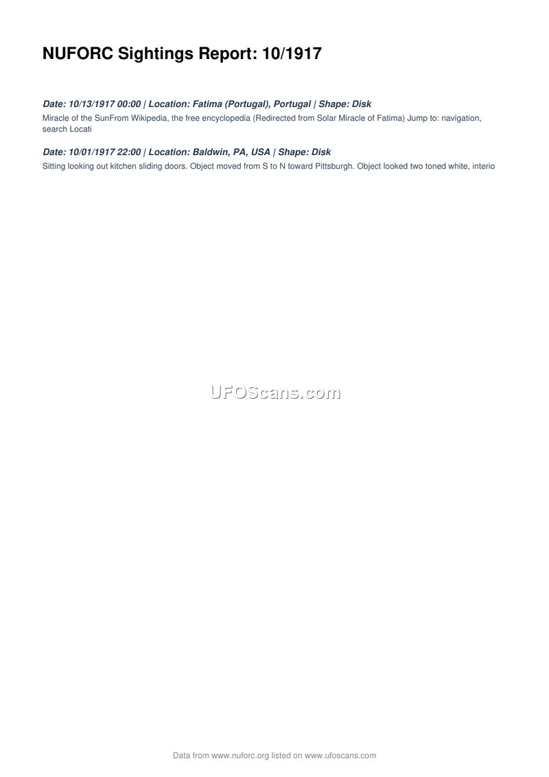 This document is a compilation of two sighting reports from October 1917, provided by the National UFO Reporting Center (NUFORC). The first entry references the 'Miracle of the Sun' in Fatima, Portugal, occurring on October 13, 1917, and notes the shape of the phenomenon as a disk. The second entry details a sighting on October 1, 1917, in Baldwin, Pennsylvania, USA. In this instance, a witness observing from kitchen sliding doors reported a two-toned white, disk-shaped object moving from the south to the north in the direction of Pittsburgh.