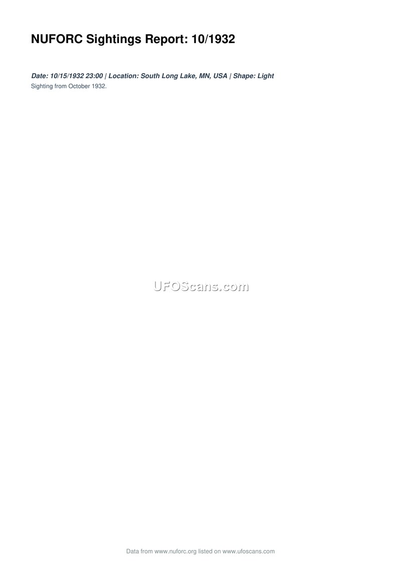 This document is a brief sighting report compiled by the National UFO Reporting Center (NUFORC). It records an event that occurred on October 15, 1932, at 23:00 hours. The location of the sighting is identified as South Long Lake, Minnesota, in the United States. The object observed is described simply as a 'Light'. No further details regarding the nature, behavior, or physical characteristics of the object are provided in the text.
