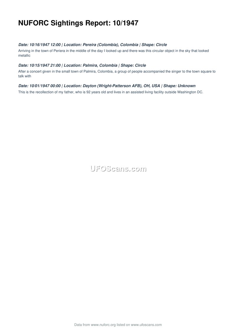 This document, titled 'NUFORC Sightings Report: 10/1947', provides a brief compilation of three distinct aerial phenomena reports from October 1947. The first entry, dated October 16, 1947, describes a sighting in Pereira, Colombia, where an observer reported a metallic, circular object in the sky during the middle of the day. The second entry, dated October 15, 1947, concerns an event in Palmira, Colombia, where a group of people accompanying a singer to a town square observed an object after a concert. The final entry, dated October 1, 1947, pertains to a recollection from a 92-year-old father regarding an event at Wright-Patterson AFB in Dayton, Ohio. The shape of the object in the Ohio incident is listed as unknown. The document notes that the data is sourced from the National UFO Reporting Center (NUFORC) and listed on ufoscans.com.