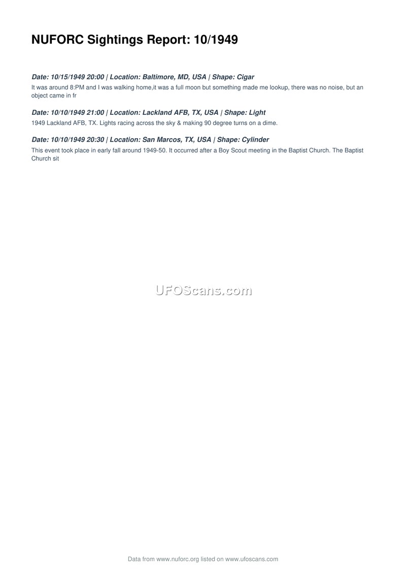 This document is a compilation of three UFO sighting reports from October 1949, sourced from the National UFO Reporting Center (NUFORC). The first report, dated October 15, 1949, describes a cigar-shaped object observed in Baltimore, Maryland, at 20:00 hours during a full moon; the witness noted the absence of noise. The second report, from October 10, 1949, at 21:00 hours, involves lights observed at Lackland Air Force Base in Texas, which were described as racing across the sky and performing 90-degree turns. The final report, also from October 10, 1949, at 20:30 hours, describes a cylinder-shaped object seen in San Marcos, Texas, following a Boy Scout meeting at a local Baptist Church.