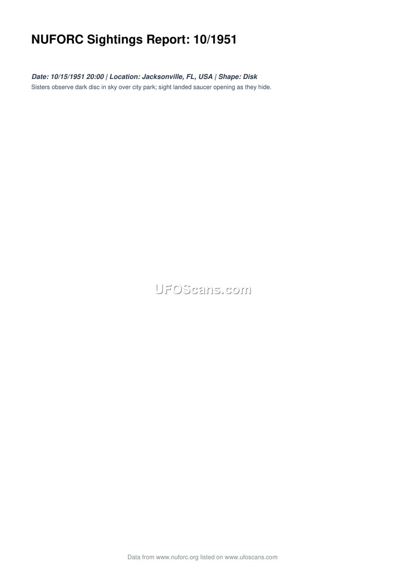 On October 15, 1951, at 20:00, two sisters observed an unidentified aerial phenomenon in Jacksonville, Florida. The witnesses reported seeing a dark, disc-shaped object in the sky above a city park. According to the report, the object subsequently landed, and the witnesses observed an opening on the saucer while they were in hiding.