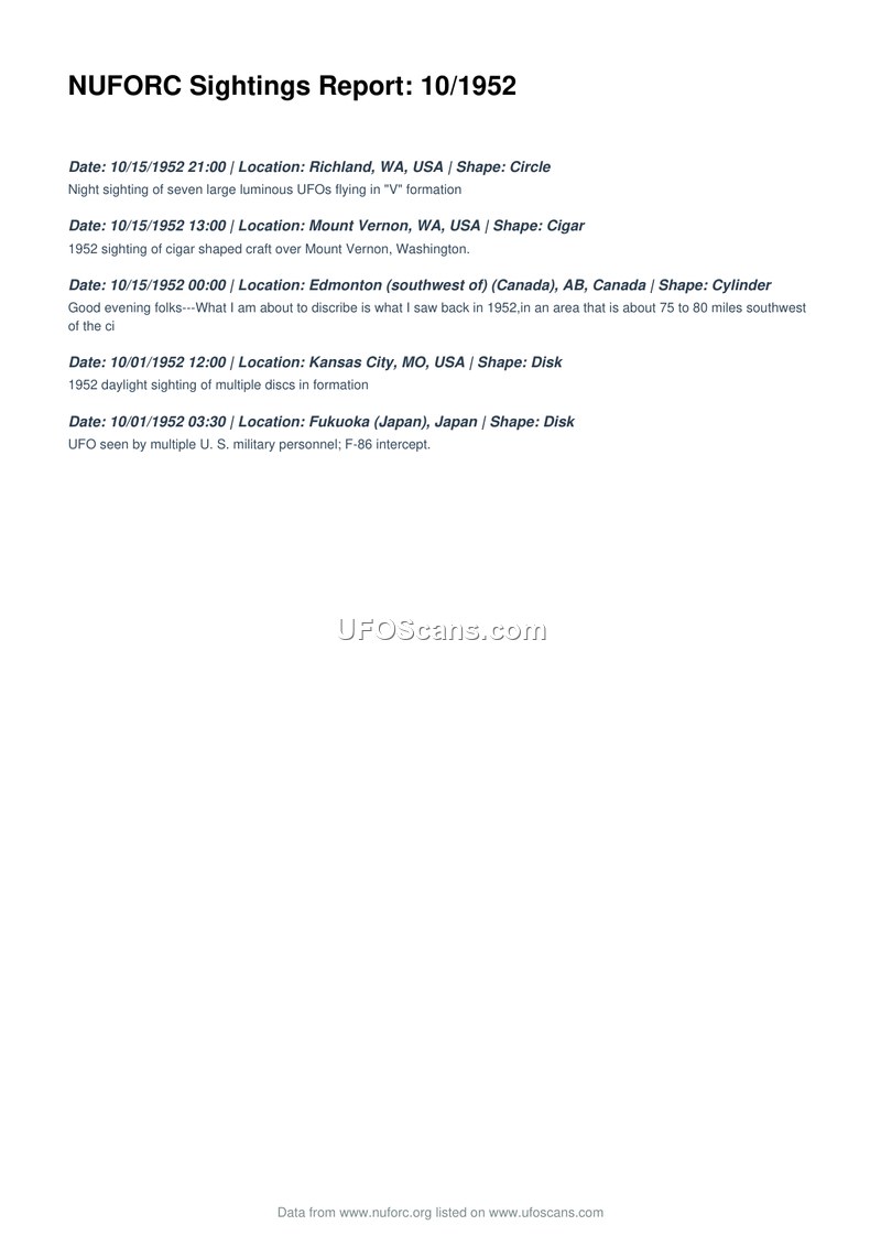 This document, titled 'NUFORC Sightings Report: 10/1952', provides a chronological list of five distinct Unidentified Aerial Phenomena (UAP) sightings reported during October 1952. The report covers a diverse range of geographic locations, including Richland, Washington; Mount Vernon, Washington; Edmonton, Canada; Kansas City, Missouri; and Fukuoka, Japan. The sightings involve various object shapes, including circles, cigars, cylinders, and disks. Notable details include a report of seven large luminous UFOs in a 'V' formation over Richland, a daylight sighting of multiple discs in formation over Kansas City, and a significant encounter in Fukuoka involving multiple U.S. military personnel and an F-86 intercept. One entry regarding a sighting in Edmonton remains incomplete, noting only that the witness was describing an event from 1952 in an area 75 to 80 miles southwest of an unspecified city.