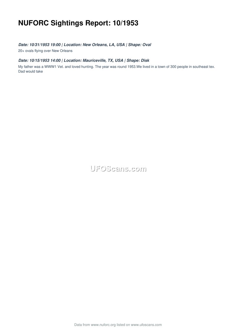This document is a compilation of two UFO sighting reports from October 1953, sourced from the National UFO Reporting Center (NUFORC). The first incident occurred on October 31, 1953, at 19:00 in New Orleans, Louisiana, where a witness reported seeing more than 20 oval-shaped objects flying over the city. The second incident took place on October 15, 1953, at 14:00 in Mauriceville, Texas. This report mentions a witness whose father, a World War I veteran, was present in a small town of approximately 300 people in southeast Texas during the sighting of a disk-shaped object.