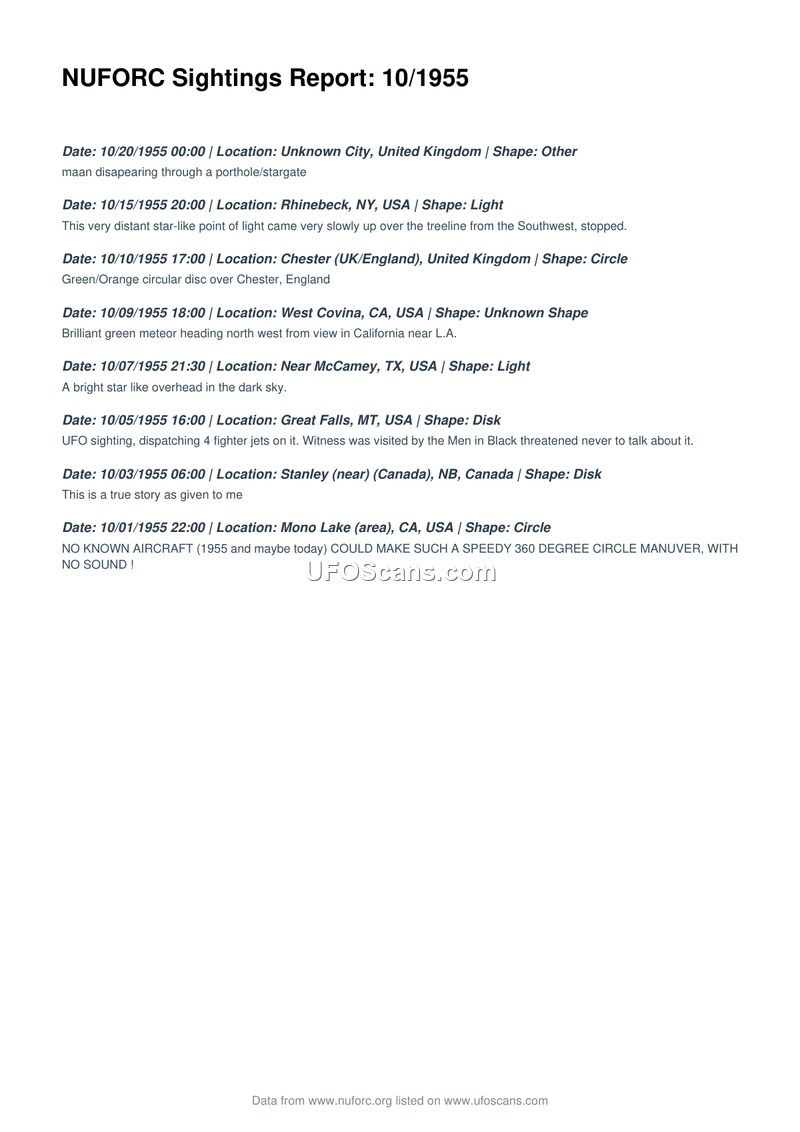 This document is a compilation of UFO sightings reported to the National UFO Reporting Center (NUFORC) for the month of October 1955. The report lists eight distinct incidents occurring between October 1 and October 20, 1955. The sightings span various locations, including the United Kingdom, the United States, and Canada. Reported phenomena include a variety of shapes such as lights, circular discs, and unknown shapes. Specific incidents noted include a sighting in Great Falls, Montana, on October 5, 1955, where the witness claimed that four fighter jets were dispatched to intercept the object and that the witness was subsequently visited by 'Men in Black' who threatened them into silence. Another report from Mono Lake, California, on October 1, 1955, describes an object performing a 360-degree maneuver at high speed without making any sound, noting that no known aircraft could perform such a feat. Other reports describe a 'porthole/stargate' in the United Kingdom, a meteor in California, and various star-like lights.