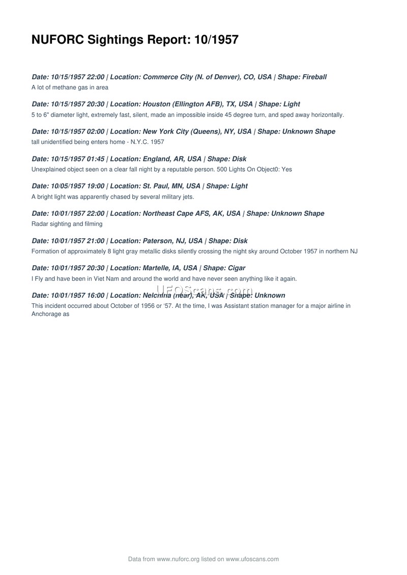 This document is a compilation of UFO sightings reported to the National UFO Reporting Center (NUFORC) for the month of October 1957. The report lists nine distinct incidents across various locations in the United States, including Colorado, Texas, New York, Arkansas, Minnesota, Alaska, New Jersey, and Iowa. The sightings involve a variety of phenomena, ranging from a fireball in Commerce City, Colorado, to a tall unidentified being entering a home in Queens, New York. Other reports describe light phenomena, such as a fast-moving light at Ellington AFB in Texas and a bright light chased by military jets in St. Paul, Minnesota. Several reports involve structured craft, including a disk seen in Arkansas, a formation of eight light gray metallic disks in Paterson, New Jersey, and a cigar-shaped object in Martelle, Iowa. Additionally, the report notes a radar sighting and filming at Northeast Cape AFS in Alaska, and a sighting by an airline employee near Nelchina, Alaska. The document serves as a historical record of these reported events as archived by NUFORC.