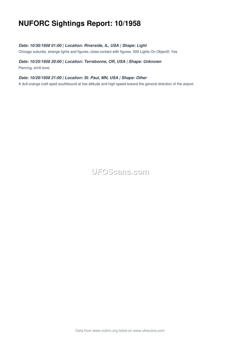 This document is a compilation of three separate sighting reports recorded by the National UFO Reporting Center (NUFORC) for the month of October 1958. The first incident occurred on October 30, 1958, at 01:00 in Riverside, Illinois. The report describes strange lights and figures in the Chicago suburbs, noting a close contact with the figures. The second incident took place on October 25, 1958, at 20:00 in Terrebonne, Oregon, and is characterized by a piercing, shrill tone. The final incident occurred on October 20, 1958, at 21:00 in St. Paul, Minnesota, where a dull-orange craft was observed traveling southbound at a low altitude and high speed toward the general direction of the local airport.