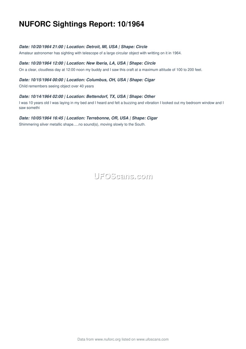 This document is a compilation of five UFO sighting reports from October 1964, sourced from the National UFO Reporting Center (NUFORC). The reports detail various encounters across the United States. On October 20, 1964, an amateur astronomer in Detroit, Michigan, observed a large circular object with writing on it through a telescope. On the same day in New Iberia, Louisiana, two individuals observed a craft at an altitude of 100 to 200 feet on a clear day. On October 15, 1964, a report from Columbus, Ohio, notes a child's memory of an object, spanning over 40 years. On October 14, 1964, in Bettendorf, Texas, a witness reported feeling buzzing and vibration while in bed at 02:00. Finally, on October 5, 1964, a shimmering silver metallic object was observed moving slowly to the south in Terrebonne, Oregon.