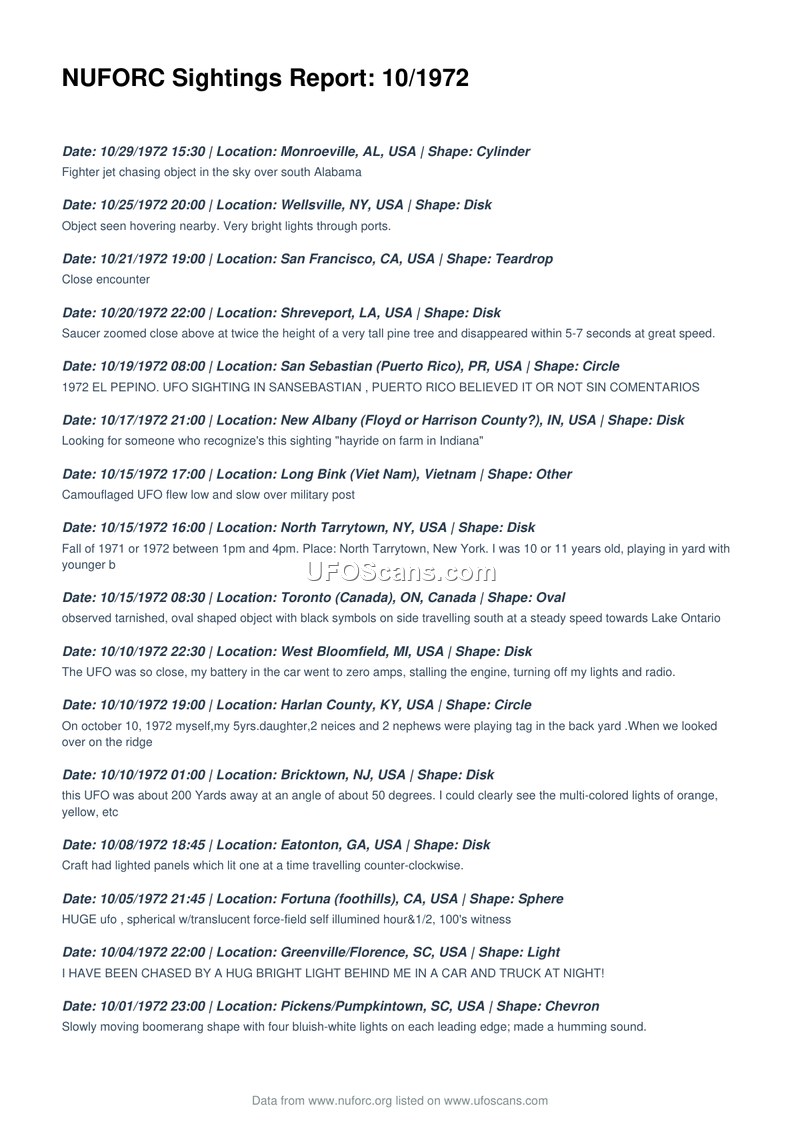 This document is a chronological list of 23 UFO sightings reported to NUFORC during October 1972. It details various shapes, locations, and witness experiences, including reports of electromagnetic interference and alleged abductions.
