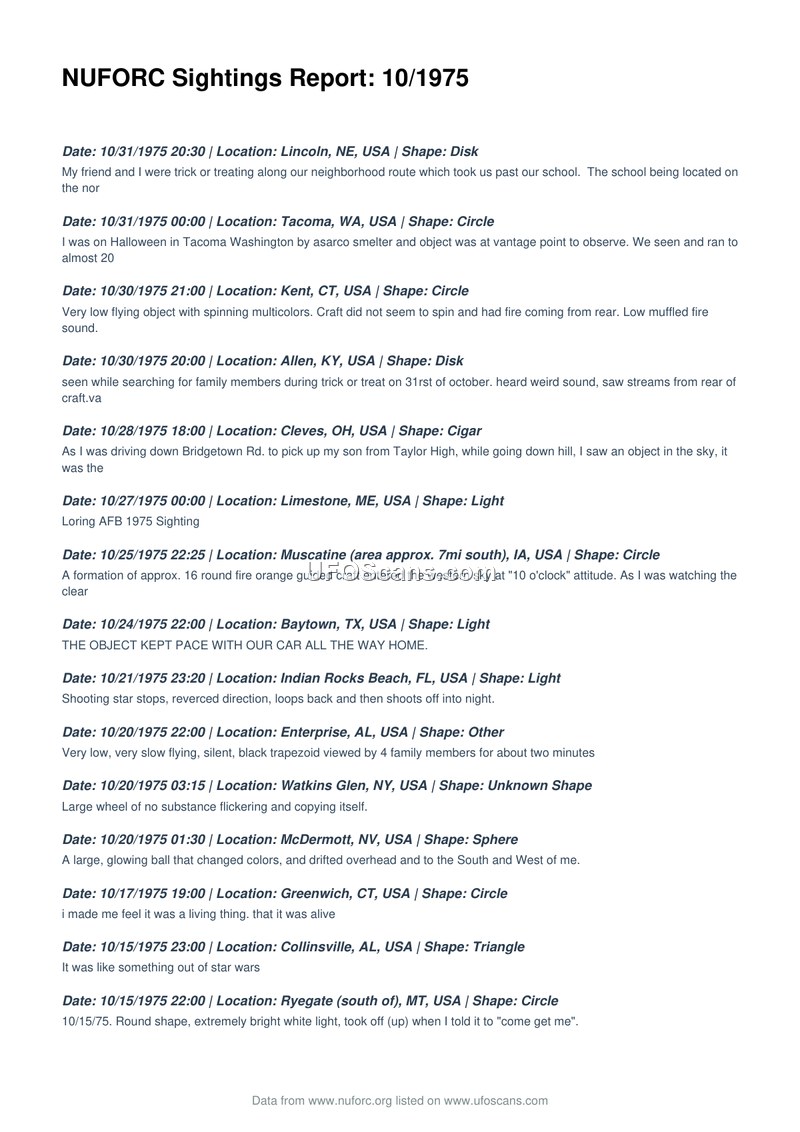 This document is a chronological list of UFO sightings reported to the National UFO Reporting Center during October 1975. It documents diverse aerial phenomena observed globally, including reports of abductions and military-related encounters.