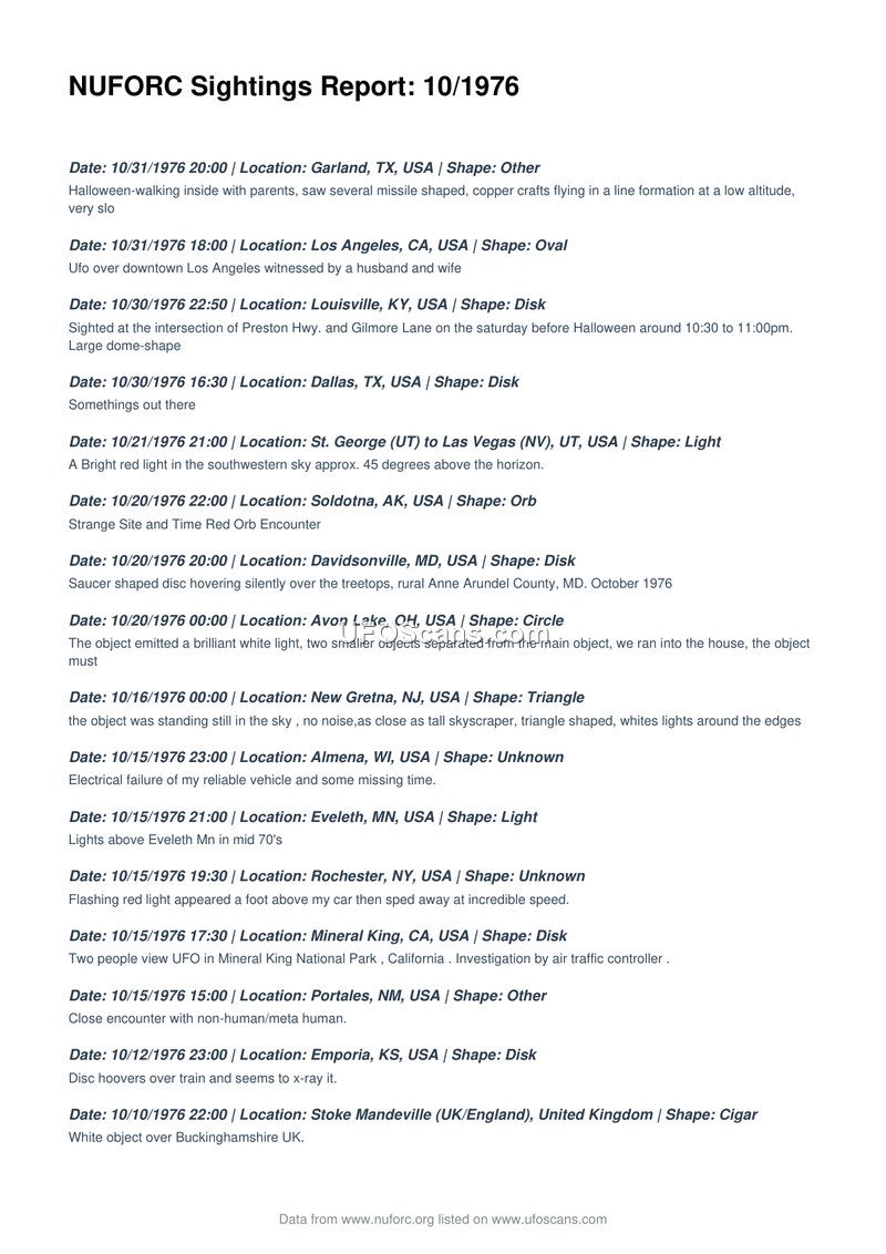 This document is a chronological list of UFO sightings reported to the National UFO Reporting Center during October 1976. It details various aerial phenomena observed across the United States and the United Kingdom, including reports near military bases.